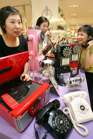 8日,首尔中区忠武路新世界百货店总店展示了模仿上世纪70年代流行的设计制造的音响、电话、闹钟等。