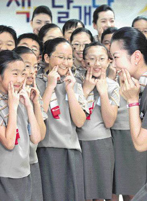 14日,在首尔江西区五钊洞韩亚航空公司的总公司举行的“一天乘务员体验教室”里,参加活动的小朋友们正在学习露出美丽微笑的方法。韩亚航空公司当天对30名小朋友进行了礼节教育和紧急逃生训练等。