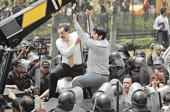 在墨西哥总统选举中失败的左派民主革命党的总统候选人安德烈斯·曼纽尔·洛佩斯·奥夫拉多尔的支持者们14日在首都墨西哥城议事堂前,与警方对峙的情况下,展开了示威。参议院议员埃里阿斯·米杰尔·莫雷诺·布里苏埃拉(音,左上)也走在了前面。奥夫拉多尔的支持者们表示只对全体投票中的9%实施重新计票是个错误,并在议事堂前搭起了帐篷进行示威。