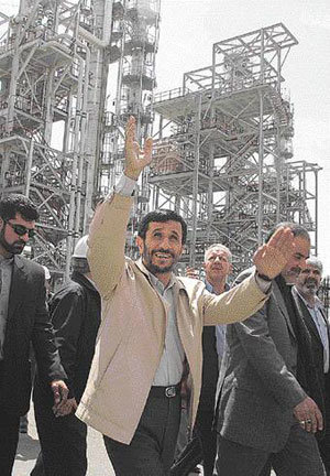 26日,在德黑兰以南320公里处的阿拉克建设的重水(heavy water)工厂举行了开工仪式,到场的伊朗总统马哈茂德·艾哈迈迪·内贾德正在挥手致意。该工厂每年将生产80吨重水,供应给正在附近建设的核反应堆用作冷却水。内贾德下决心说:“伊朗国民将用武力来守护拥有核技术的权力。”
