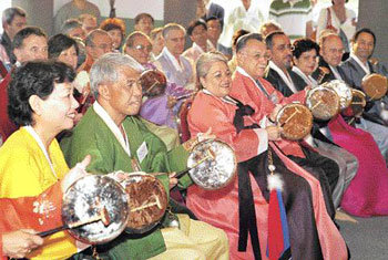 4日下午,访问德寿宫的各国驻韩国大使夫妇身穿韩服,正在学习敲铜锣的方法。当天的活动是文化观光部为了向驻韩外交使节团介绍韩国文化而准备的传统艺术体验活动之一。