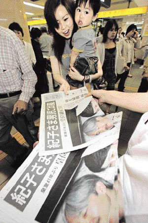 6日,日本明仁天皇的二儿媳川岛纪子(39岁)王妃在东京爱育医院剖腹产下一名男婴。当天出生的婴儿继德仁王世子和秋筱宫王子之后,成为第三选王位继承人,从而延续了日本皇室的父系嫡亲体系。这是时隔41年,日本皇室首次诞生男丁。图为,看到《朝日新闻》号外的市民激动不已。