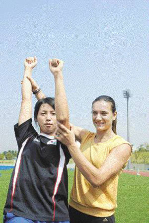 正在晨练的崔允喜从远处向伊辛芭耶娃打招呼,对方也很愉快地回应。2004年末在俄罗斯伏尔加格勒一起训练时,她们两个人见过面,如今已经过了1年半的时间,但她们之间依然保持着温暖的气氛。