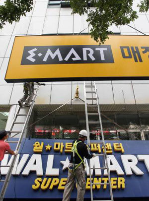 11日,沃尔玛韩国的京畿花井店换上了新世界易买得的招牌。被新世界易买得收购的全国16家沃尔玛店将在12日之前结束店铺的内部工程,更换招牌。