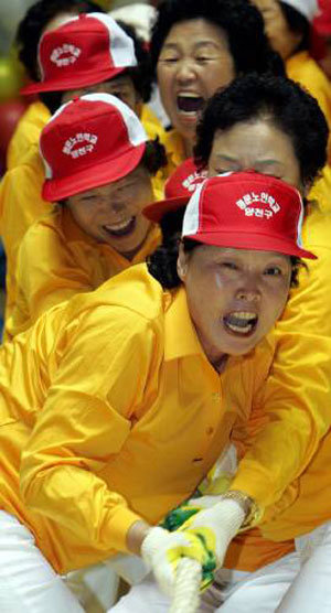 11日在首尔Jangchung体育馆内举行的大韩老人会首尔市联合会体育大赛上,参加拔河比赛的老人们正在拉绳。