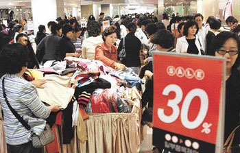 主要百货商店纷纷从13日开始展开了秋季定期打折促销活动。位于首尔中区小公洞的乐天百货商店总店的登山服卖场因川流不息的顾客而拥挤不堪。秋季定期打折促销活动将持续到29日。