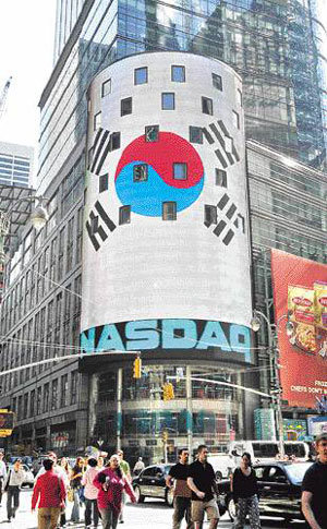 韩国证券期货交易所表示,14日(当地时间)同美国纳斯达克签订了信息交换及相互合作的合作草案(MOC)。为纪念签订MOC,纳斯达克在位于美国纽约曼哈顿的纳斯达克建筑外壁挂上了太极旗。