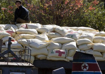 20日,一名男子坐在堆积在北韩新义州市码头的救援物资上。大米袋上写着“40公斤大米”、“大韩红十字会”的字样。
