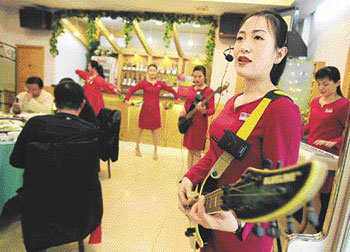 22日,中国辽宁省丹东市一家北韩餐厅的女服务员们正在为就餐的顾客表演歌舞。