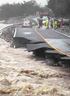 7月中旬被暴雨冲毁的江原麟蹄郡以北寒溪3里的公路因22日和23日降下的暴雨再次塌陷,寒溪岭方面禁止车辆通行。图为,在塌陷的公路下方流淌着泥水。