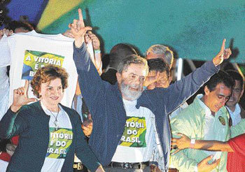 29日,在圣保罗,领导执政劳工者党的巴西总统路易斯·伊纳西奥·卢拉·达席尔瓦(中)确定连任之后,正在与夫人玛丽萨·莱蒂西娅(左)一同向支持者们挥手致谢。