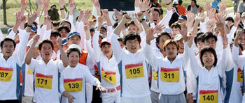 5日,在位于首尔汝矣岛63大厦前的汉江市民公园秀边(音)广场举行了“雇佣许可制一元化纪念短程马拉松大会”。外国职工和企业家们参加了该大会。图为,外国职工和韩国企业家们在出发前正高喊“加油”。