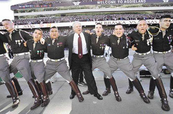 图为,11日,德克萨斯A&M大学校长罗伯特-盖茨(中)在学院站进行的该大学美式足球比赛前,与后备军官训练队(ROTC)的学生们搭着肩膀正在助威。罗伯特-盖茨被任命为最近被撤换的国防部长拉姆斯菲尔德的接班人。如果这些学生成为军官,他将成为他们的“上司”。