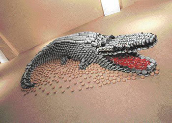 這種鱷魚不是“crocodile”,而被稱作“cro-can-dile”。用鐵罐(can)製成的鱷魚模型14日在美國紐約的Canstruction(鐵罐構造物)展示會上亮相。