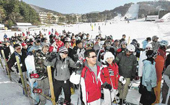 滑雪场开门后迎来首个周末的18日,来到江原道平昌郡龙平滑雪场的滑雪爱好者和单板滑雪爱好者们露出欢快的表情等待上山缆车。