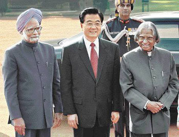 21日,印度总理辛格(左)和印度总统阿卜杜尔-卡拉姆正在迎接访问印度新德里的中国国家主席胡锦涛(中)。胡锦涛与辛格进行首脑会谈后表示:“解除相互间的不信任,为加强双方合作,将采用10种战略。”