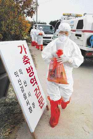 随着在全北益山市发现疑似禽流感(AI)病毒,23日,国立兽医科学检疫院的检疫人员为进行检查正在进入益山市的一家养鸡场。