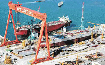 现代重工业于2004年10月在世界上最先发明了陆地造船工法并获得成功。该工法是在地面上建造船只之后,利用较高的空气压力让船漂起来,然后下水到海上的建造方式。