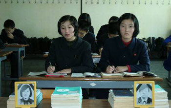 平壤牡丹峰第一中学为2002年被美军装甲车碾死的申孝顺、沈美善保留了座位。图为,该中学的一个教室。该校在2003年将两名女学生录取为名誉学生,去年3月还颁发了毕业证。