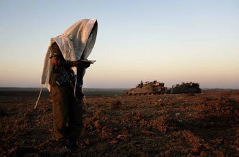 图为,26日凌晨,从巴勒斯坦加沙地区撤出的以色列士兵在边境地区戴着披巾(祈祷用的披肩),看着《圣经》正在祈祷。在他的背后有坦克。以色列和巴勒斯坦从当天上午6时开始停止纷争,正式停战。但双方互相指责对方违反停战协议,关系仍处于不稳定的状态。
