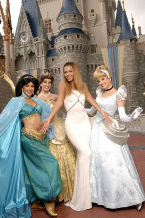在位于佛罗里达州美景湖(Lake Buena Vista)的迪斯尼魔幻王国内,美国流行歌手比昂斯·诺斯(右二)正和漫画人物《阿拉丁》中的茉莉公主(左)、《美女与野兽》中的美女(左二)、灰姑娘一起拍摄ABC电视台25日播放的《迪斯尼圣诞节游行》节目。