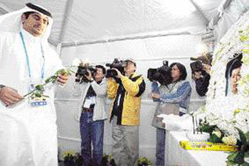 在多哈亚运会综合马术比赛途中意外坠马身亡的已故运动员金亨七(47岁,金鞍会)的焚香所被设在选手村内的public zone。
