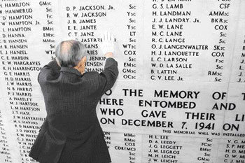 袭珍珠港65周年纪念仪式上,抚摸刻有牺牲者名字的墙壁。