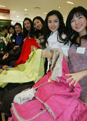 10日,在首尔城北区吉音洞现代百货商店弥阿店内举行的义卖活动中,韩国小姐冠军李荷妮(右二)等2006韩国小姐选美大赛获奖者正在卖服装。现代百货商店和合作公司捐赠的这些服装销售收益金将全部捐赠给慈善团体。