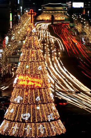 树立在首尔市厅前首尔广场上的大型圣诞树点亮了首尔城市中心的夜晚。韩国基督教总联合会设置的圣诞树将在每天夜里点亮,直到明年1月14日。