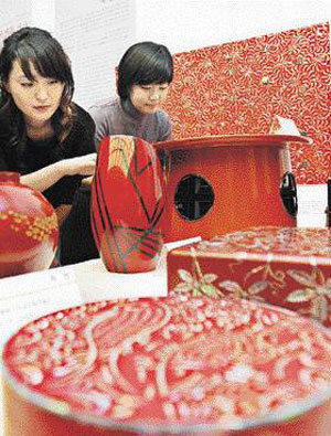 13日,首尔中区小公洞乐天百货店精品店Avenuel推出了“韩国日本漆工艺大展展示会”。参观者正在端详朝鲜王朝曾使用过的朱黄色日本漆工艺品。这次展会展示了茶桌和宝石盒及卷轴教旨盒等81件工艺品。