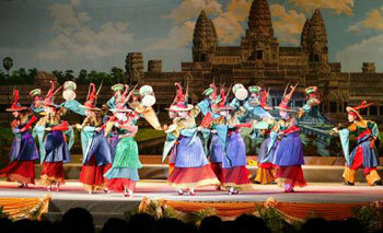图为,在上月21日举行的吴哥-庆州世界文化展览会开幕式上的韩国队演出场面。鞠守镐舞蹈团用鼓声唤起了神秘之地——吴哥窟(Angkor Wat)。