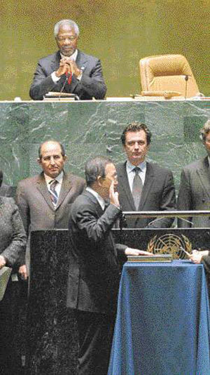“潘基文联合国时代”已经开始。14日(当地时间),下届联合国秘书长潘基文宣誓就职后,发表演说强调称:“作为联合国秘书长要做的第一件事就是恢复信任。我将成为和解的桥梁。”