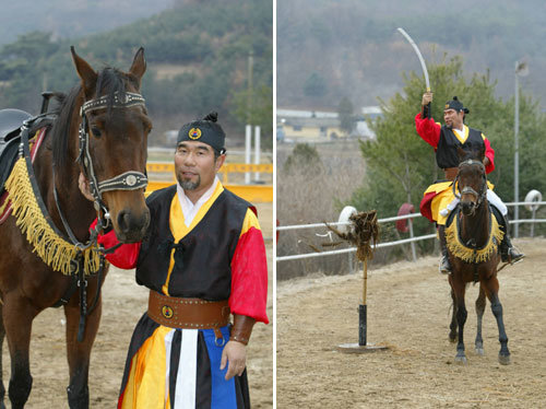 말 위에서 칼이나 창, 도리깨, 활 등의 무기를 다루는 마상무예를 고성규(46) 씨는 9년째 연마하고 있다. 17일 경기 양주시 장흥면에 있는 승마장 마구간에서 만난 고 씨는 체격은 작지만 살아있는 눈빛과 사극에서나 봄 직한 턱수염 때문인지 무척 강인해 보였다.