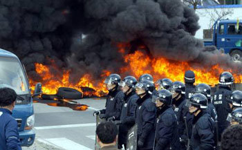 25日上午,在庆北庆州市阳北面一带,500多名居民举行示威,敦促韩国水利原子能公司迁回阳北面。图为,他们在道路中央用旧轮胎点火,与警方对峙。