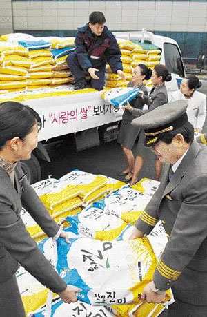 27日,韩亚航空公司在首尔江西区五钊洞总公司举行了向不幸的邻居送爱的大米的仪式。当天被送往江西区厅社会福利科的500袋大米将送给独居老人和无人照顾的孩子等江西区内的低收入家庭。