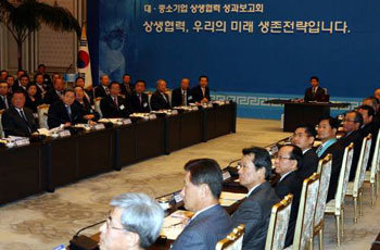 图为,28日,卢武铉在青瓦台迎宾馆正在主持大、中小企业互助成果报告会。卢武铉在报告会上说:“参与政府既有自己的特点,又有业绩。”
