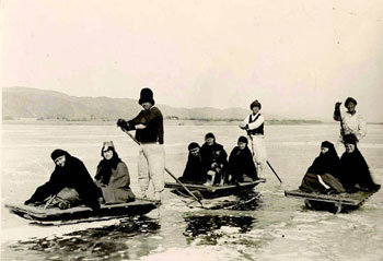1924年,在新义州,碧眼的修女们坐着雪橇横渡结冰的鸭绿江。坐在雪橇上的修女们像孩子一样露出灿烂的笑容。