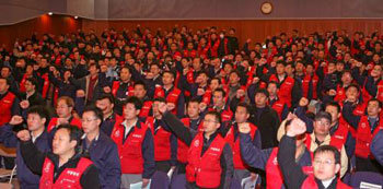 在蔚山北区杨亭洞现代汽车文化会馆内举行的临时代议员大会上,现代汽车的工会代议员正在喊口号。
