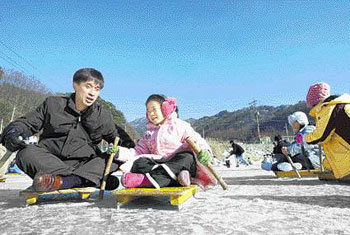 休息日的14日,随着小寒的寒冷退去,全国各地迎来了冬天的游客。当天下午,在京畿抱川市白云溪谷冰面上,儿童们滑着雪橇,度过愉快的时间。和孩子们一起玩耍的爸爸们脸上也洋溢着快乐的笑容。抱川市举办的冬将军庆典将持续到28日。
