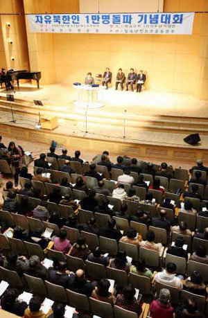 27日下午,逃北者在首尔钟路区莲池洞韩国教会100周年纪念馆内举行了“自由北韩人突破一万人次纪念大会”。当天的活动由逃北难民保护运动本部主办。