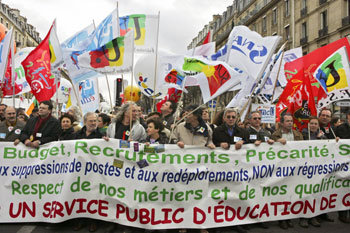 8日,数千名法国公务员为反对政府精简组织和削减预算,举行了一天罢工。图为,他们正在进行街头示威。
