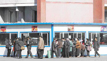 韩国代表团为参加南北部长级会谈访北的2日,在平壤昌光街一家简易食品销售店门前,北韩居民正在排队购买食品。该销售店出售烤栗子和烤地瓜。