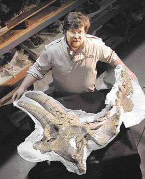 5日,美国俄亥俄州克里夫兰自然历史博物馆的迈克尔·莱恩(音)博士正在展示长着犄角的恐龙“阿拜勒塔塞拉托布斯·奈斯穆伊”(音)的头盖骨化石(左)。据推测生活在7800年前的该草食恐龙身长6米,眼眉上方看似生长着一米左右的犄角(下方假想图)。6年前,莱恩在加拿大卡尔加里大学学习时,在阿尔伯达州南部发现了这个化石。