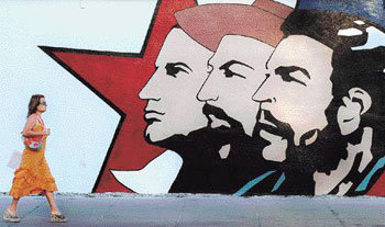 13日,一名女性正从古巴哈瓦那的旧总统宫附近带有青年共产主义党标记的墙边走过。50年前的今天,大学生联合会主席安东尼奥·埃切维里亚为推翻独裁者巴蒂斯塔政权而举行起义,但最终失败。18个月后再次起义,成功引领古巴革命的国务委员会主席菲德尔·卡斯特罗没有出现在纪念仪式上。尽管最近出现了他的身体情况有所好转的各种猜测。
