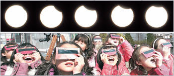 19日上午10时48分到中午12时16分为止的88分钟里,随着太阳、月亮、地球运行到一条直线上,出现了太阳的一部分被月亮遮住的日偏食现象。从上午11时到中午12时为止,以15分钟的间隔,用Canon Mark II N相机进行了拍摄。快门速度是1/8000,镜头是500毫米,转换器(converter)1.4,虹膜(iris)是32,使用了ND 8x过滤器(上图)。当天,参加京畿军浦市大夜图书馆的Nuri天文台(音译)“日偏食观测活动”的小朋友们,正在用太阳滤镜观测日食。