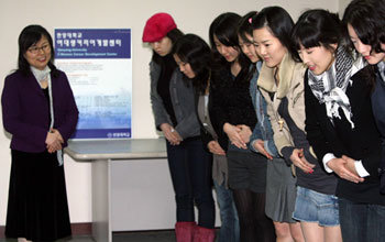 19日,在汉阳大学女大学生职业规划开发中心举行的面试实习教育活动上,前来参加的女大学生们正在学习双手合在一起,谦恭地打招呼的方法。