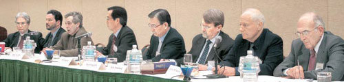 26日,在美国华盛顿乔治敦大学举行的国际学术会议上,韩国和美国韩半岛专家就解决北核问题和落实韩半岛稳定方案进行了磋商。会议的主题为“《2.13共同文件》后的韩半岛与东北亚未来”,由东亚日报社下属机构花井和平基金会和21世纪和平研究所举办。左起为金达中(延世大学名誉教授)、麦克·格林(乔治敦大学教授)、吉伯特·罗兹曼(普林斯顿大学教授)、韩升洲(高丽大学,前外务部长官)、朴庸玉(翰林国际研究生院副校长)、理查德(韩国经济研究所所长)、孟南水(乔治敦大学教授)、石眼山(乔治敦大学亚洲研究所所长)。