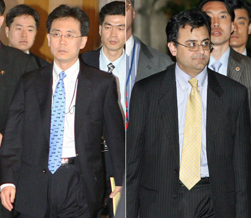 한미 자유무역협정(FTA) 협상이 결단의 순간을 맞았다. 통상장관급 최종 회담 나흘째인 29일 오전 양국 협상 주역들이 굳은 표정으로 서울 용산구 한남동 그랜드하얏트호텔 협상장에 들어가고 있다. 왼쪽 사진은 김현종 통상교섭본부장, 오른쪽 사진은 카란 바티아 미 무역대표부(USTR) 부대표.