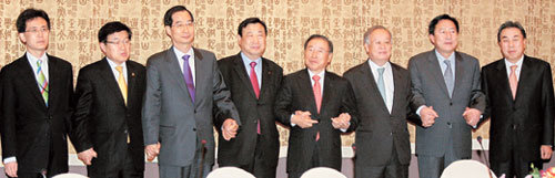 韩美自由贸易协定(FTA)民间对策委员会3日在首尔中区太平路广场酒店举行会议,敦促政府和政界把因韩美FTA造成的国内损失降至最低并尽快得到国会批准。左起为通商交涉本部长金铉宗、产业资源部长官金荣柱、国务总理韩德洙、韩国贸易协会会长李熙范、全国经济人联合会会长赵锡来、大韩商会会长孙京植、中小企业中央会会长金基文、全国银行联合会会长柳志昌。