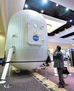 未来在月亮基地上使用的住宅“房屋模型”10日公开亮相。ILC DOVER公司在位于美国科罗拉多州科罗拉多泉城的布罗德穆尔酒店举行的第23届全美宇航研讨会(9日∼12日)上,展示了作为月亮基地上的住所和建筑使用的“行星表面居住用密封减压室”模型,吸引了与会人员的目光。